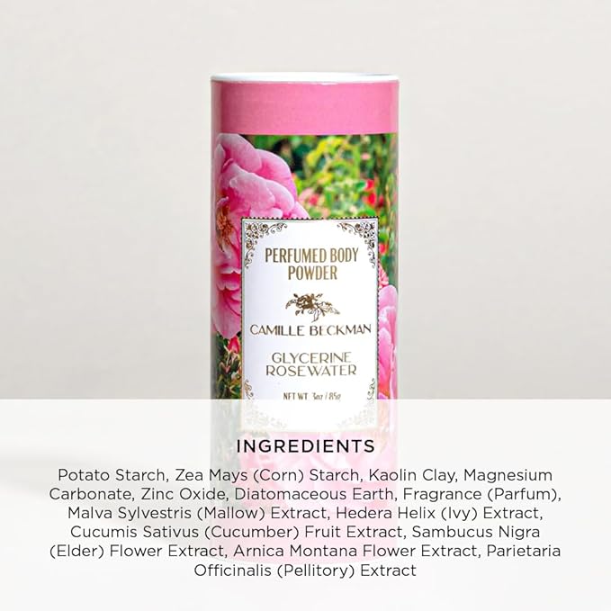 Glycerine Rosewater Scented Talc-Free Body Powder, Perfumed Dusting Powder, Camille Beckman, 3 Ounce