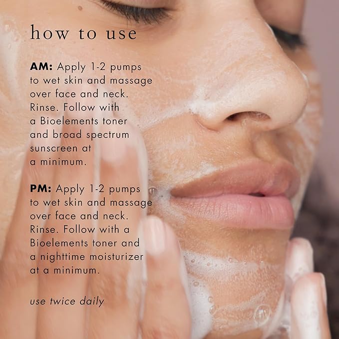 - HOW TO USE - In the AM, apply Bioelements Flash Foam Cleanser to wet skin and massage over face. Rinse. Follow with a toner & broad-spectrum sunscreen. In the PM, apply to wet skin and massage over face. Rinse. Follow with a toner & moisturizer.