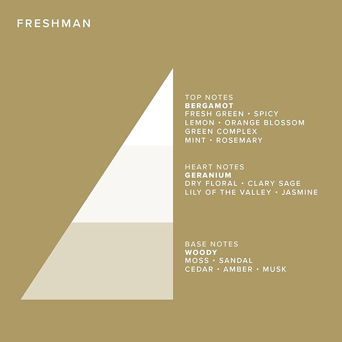 - FRESHMAN: The fragrance has top notes of lemon, bergamot, rosemary, mint, and orange blossom surrounding a heart of clary sage, lily of the valley and jasmine which rests on base notes of mint, sandal, cedar, amber, moss, and musk
