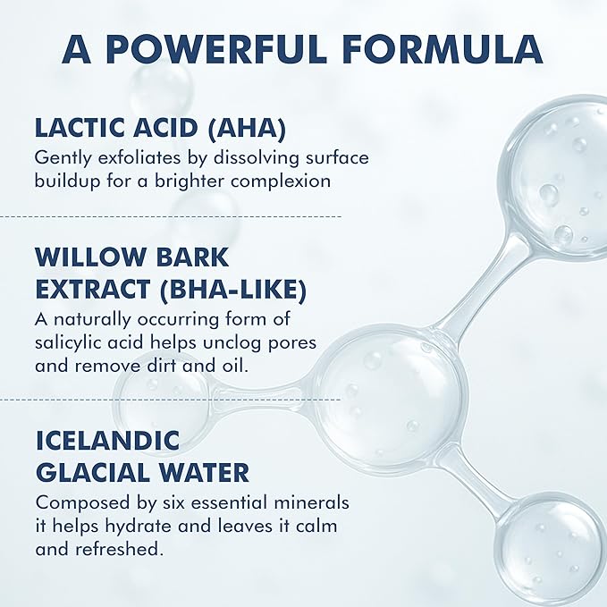- Natural AHA and BHA blend: Lactic acid and white willow bark work together to promote cell turnover and improve visible skin texture while addressing clogged pores and uneven skin tone