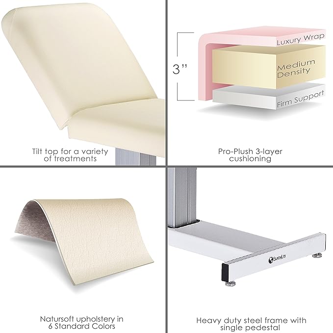 - FEATURES - Heavy Duty Steel Frame, Single Pedestal, Reliable Motor, Rounded Salon Corners, Luxuriously upholstered top with rounded Salon Corners, Pro-Plush Deluxe 3-Layer 3โ Cushioning System, Comfort-Flex Upholstery โ 100% PU, Hands Free Foot Control