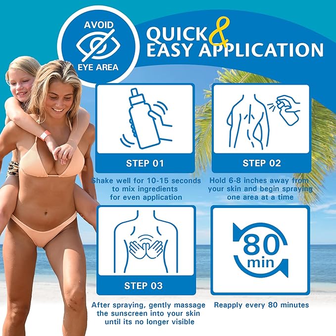 - LONG-LASTING SUN PROTECTION GREAT FOR ALL TYPES OF SKIN. Our 50 spf sunscreen spray comes in an 8.5 oz bottle, enough for several uses. To apply, wait 15 minutes before exposure, apply to all skin areas except the eye, and reapply every 80 minutes.