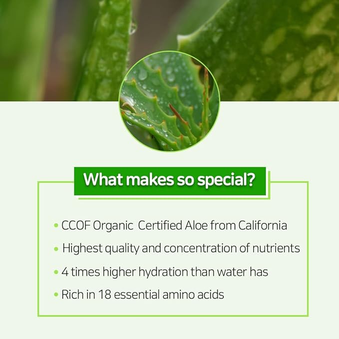 - ✔️ RELIEVING OUR SKIN WITH ALOE VERA: Contains California Aloe leaves extract. Under the strong sunshine of California, it grew up with the highest concentration of nutrients. Contains 4 times higher hydration than water. CCOF certified how safe ingredient this aloe is