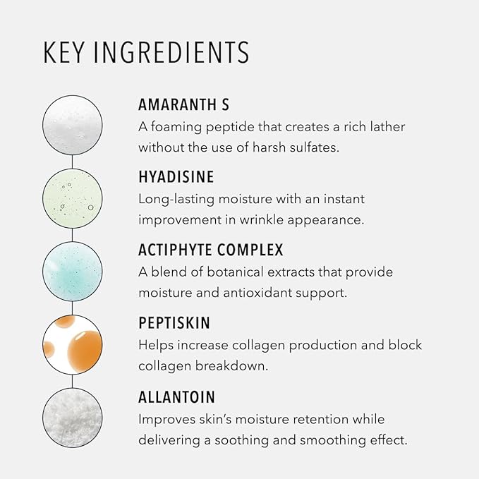 - Sulfate-Free: Blend of key ingredients Amaranth-S, Hyadisine, Actiphyte Complex, Peptiskin & Allantoin create an indulgent lather without the use of sulfates, r ncrease collagen production, retain hydration and soothing effect