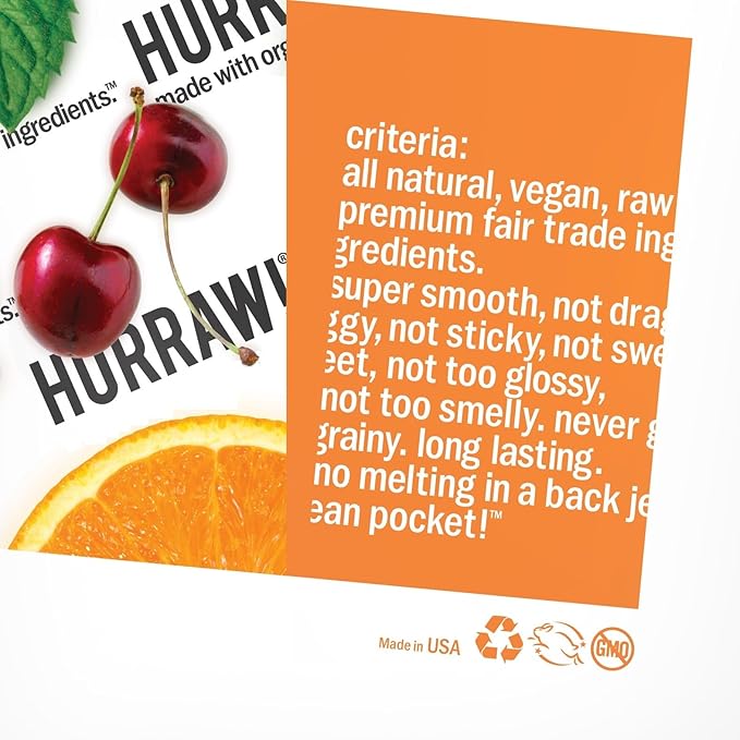 - CRITERIA: Hurraw! Lip Balms are all natural, vegan, raw, made with premium fair trade ingredients, super smooth, not draggy, not sticky, not sweet, not too glossy, not too smelly. Never grainy. Long lasting and no melting in a back jean pocket! Made in Montana, USA.