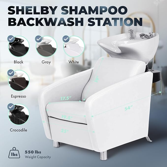 - ππππππ ππππππππ ππππππ: The Shelby Backwash Station offers sleek European styling with smooth vinyl upholstery, metallic legs, and clean lines. Its aesthetic blends seamlessly into upscale salon environments while delivering ergonomic function and full-body support.