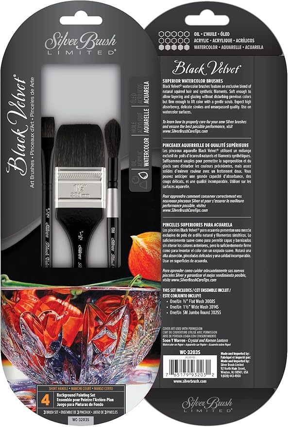 Silver Brush Limited WC-3203S Black Velvet Background Painting Set, Premium Paintbrushes for Watercolor, Gouache, Inks & Dyes, Set of 3, Flat Wash, Wide Wash, and Small Jumbo Round Brush, Short Handle