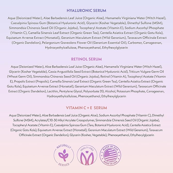 - Natural Serum Kit: Hyaluronic Acid Serum, Retinol Serum 2%, and Vitamin C and E Serum are made in the USA with effective natural skincare ingredients, cruelty-free, paraben-free, formaldehyde-free, propylene-free. Additionally, they contain green tea, vitamin E, and aloe