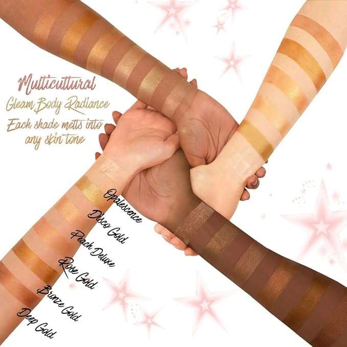 - Peach Deluxe: Peach Deluxe is a champagne pop of color with soft peachy undertones and is a favorite to use on all skin tones. Use as a primer for face & highlighter or all over body for perfected glowing skin. Gleam’s lightweight moisturizing makeup will help diminish minor imperfections while hydrating skin and improving skin appearance.