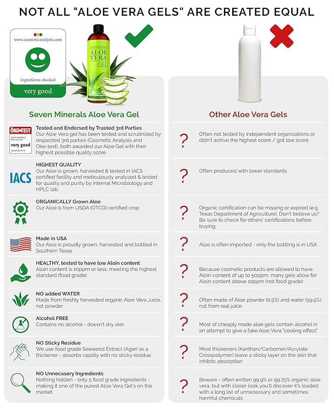 - ✅ THE DIFFERENCE in skin treated with Seven Minerals Aloe Gel is striking. Thanks to 100% natural thickener Seaweed Extract (instead of Xanthan or Carbomer), it absorbs rapidly with no sticky residue - leaving your skin smooth and silky.