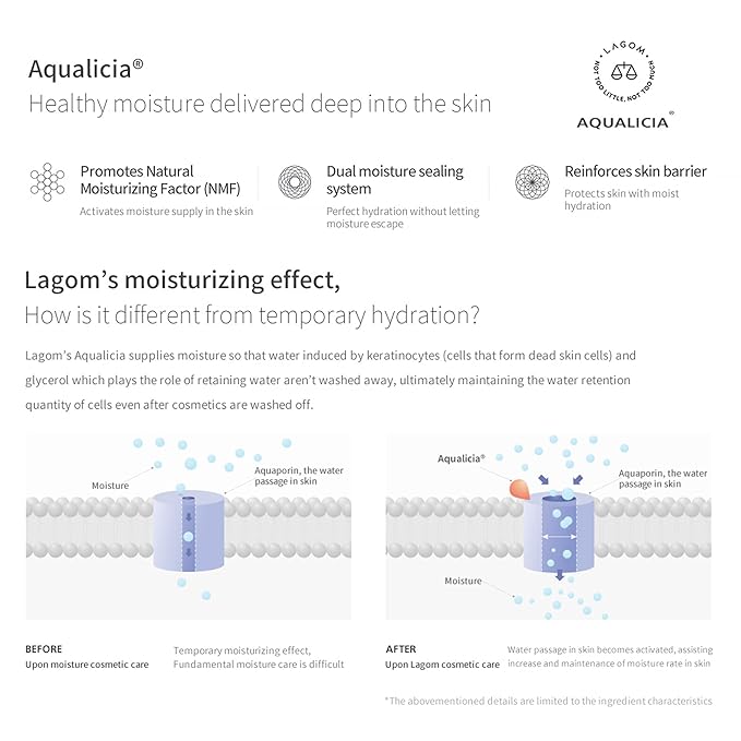 - PATENTED INGREDIENT HELPS WIDEN MOISTURE CHANNELS: Lagom’s patented Aqualicia, a peptide derived from the Acacia tree, helps facilitate Aquaporins, a Nobel Prize-winning discovery known as the water channels in the cell membrane, assisting water molecules to flow deep and retain moisture in the skin.