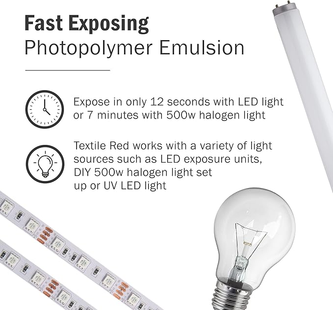 - Designed For Long Use - When used with your preferred silk screen printing kit this emulsion is ultra durable and can be cured with a emulsion exposure unit, or DIY light . Neither is use is not an issue with this emulsion. Use an emulsion scoop coater for clean even coverage.