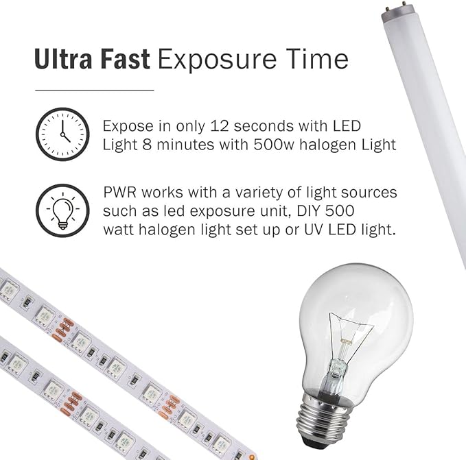 - Works Great with All Exposure Units - Whether you are using an led exposure light unit, DIY 500 watt halogen light set up or an ultra violet LED light this silk screen emulsion will expose quickly and easy.