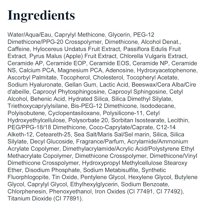 - Active Ingredients : caffeine,ceramide,cetyl alcohol,glycerin,lactic acid,polysorbate 20,silica,tocopherol