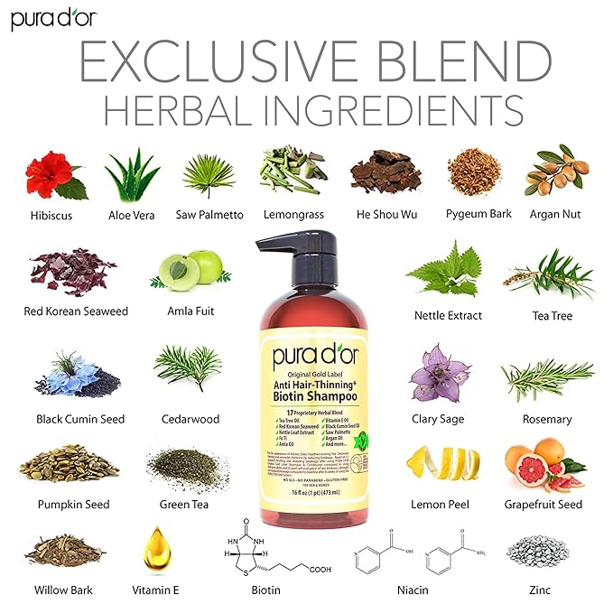 PURA D'OR Anti-Thinning Biotin Shampoo & Conditioner Gold Label Set (16oz x2) Natural Botanical Scent – CLINICALLY TESTED Stronger-Feeling, Thicker-Looking Hair, Volume & Less Breakage – Men & Women