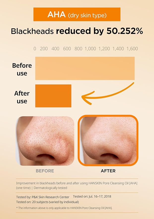 - Waterproof Makeup Remover & Non- eye irritation: Effortlessly dissolve even the most stubborn waterproof makeup without causing eye irritation. Hanskin’s gentle AHA Pore Cleansing Oil purifies pores while being kind to your eyes, leaving your skin clean, refreshed, and balanced.
