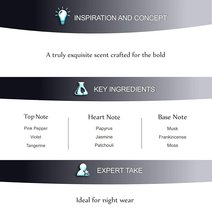 - This oriental spicy fragarnce has a blend of pink pepper, tangerine, violet, nutmeg, papyrus, patchouli, jasmine, earthy notes, sweet notes, atlas cedar, incense, tonka bean and tobacco