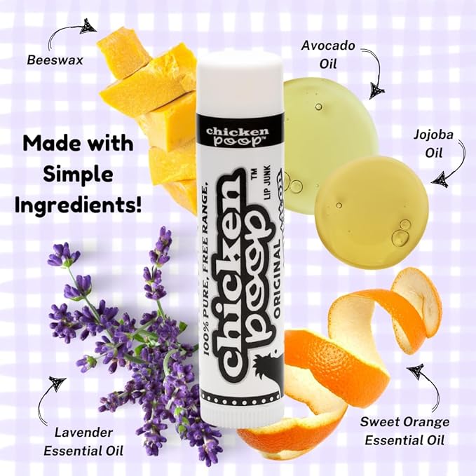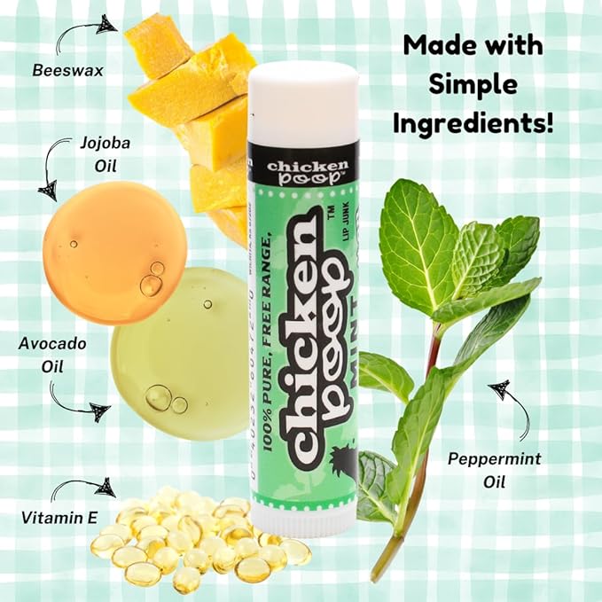 Chicken Poop Lip Balm Simone Chickenbone 100% Natural Moisturizer for Dry, Chapped Lips, Combo (Original, Mint, Outdoors with SPF 30, Coconut), 4 Pack