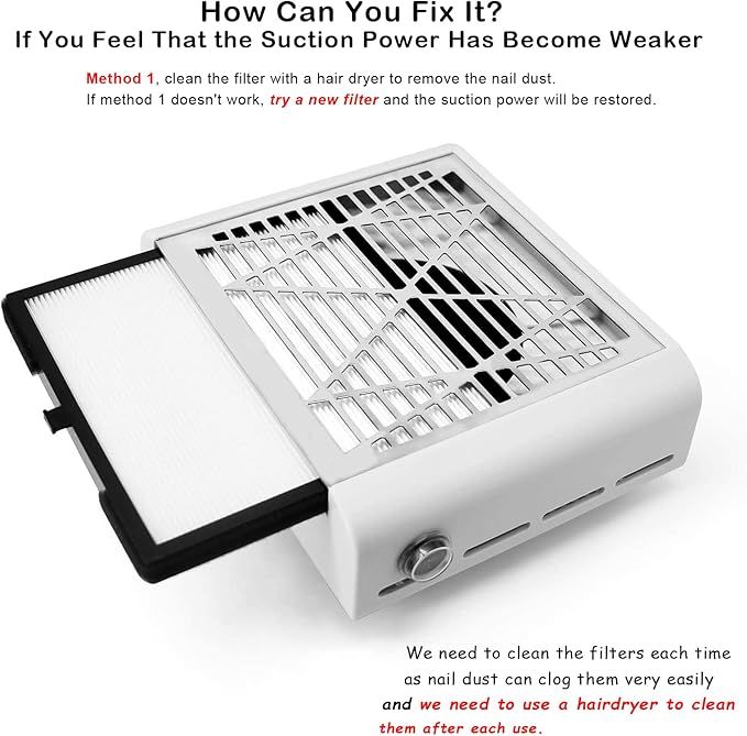 - This nail dust vacuum machine with high suction fan, so it sucks nail dust well when you remove the acrylic nails. (USE TIPS, when you remove nail gels, please keep your nails close to the machine.)