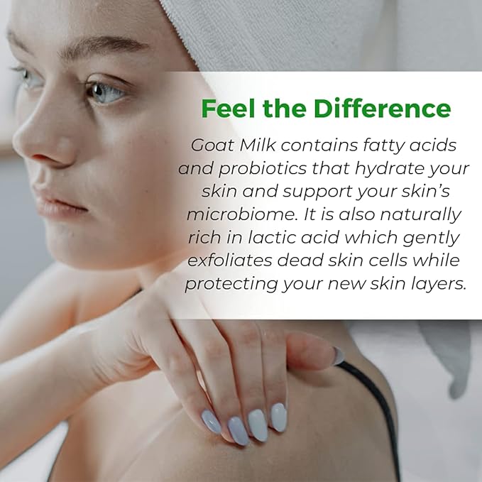 - THE SKIN BENEFITS OF GOAT MILK : Indulge in the luxurious benefits of goat milk for your skin. Packed with essential fatty acids and probiotics, it deeply nourishes and hydrates, fostering a vibrant skin microbiome. Its natural lactic acid content delicately exfoliates, revealing renewed layers of skin, while safeguarding against dryness.