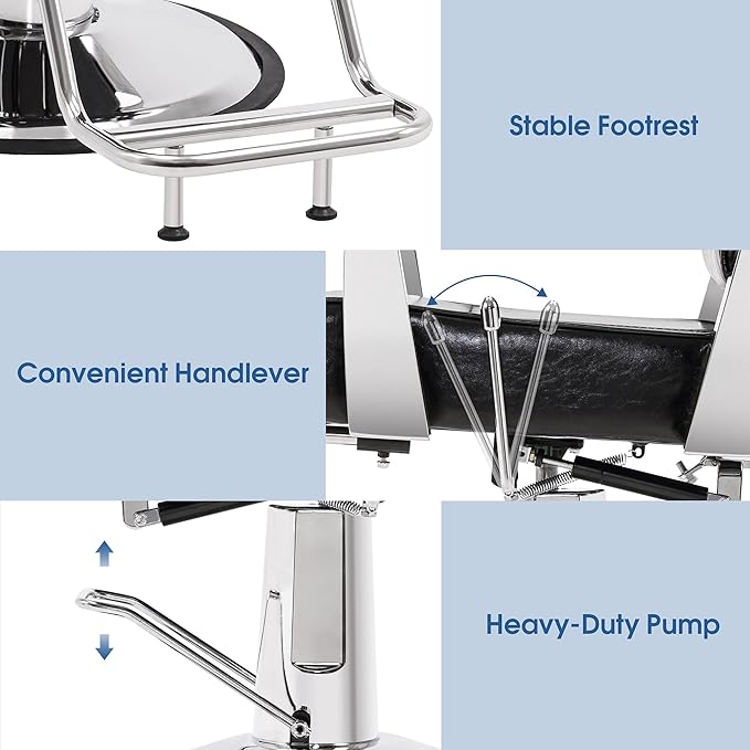- High Practicability: Footrest with peg that upgraded for better stability and appearance. Padded with soft small cell high density foam in backrest and seat cushion, considerably thick on headrest backrest and seat, super comfort when clients sit in with padded cushion on the armrest. Hair dryer Holder beside the recliner lever for hair stylist to use. Made from soft bi-cast leather which is more convenient to clean.Easy to install and move, especially for ladies.