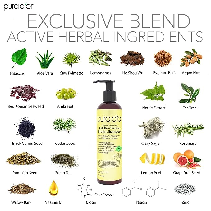 PURA D'OR 8 Oz Original Gold Label Anti-Thinning Biotin Shampoo Natural Earthy Scent, CLINICALLY TESTED Effective Results, Herbal Blend Hair Thickening Products, Women & Men, Color Treated Hair