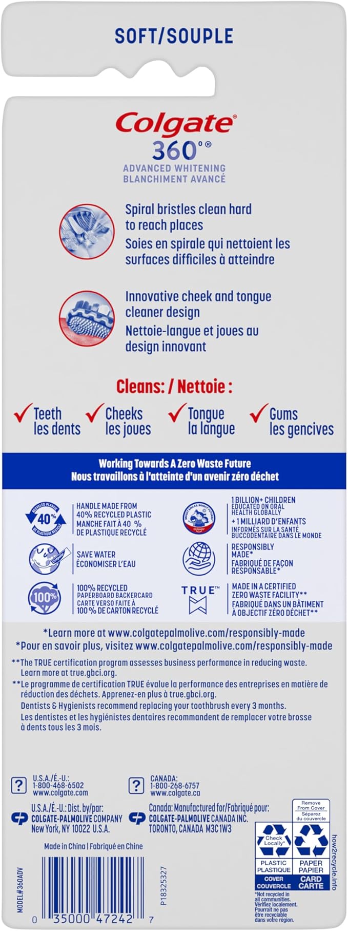 Colgate 360 Advanced Optic White Whitening Toothbrush with Tongue Cleaner, Soft, 4 Count