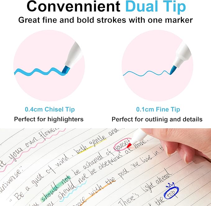 - DOUBLE ENDED DESIGN: Shuttle Art dual tip mild highlighters with broad and fine twin tips for both highlighting and underlining. The versatile chisel tip measures about 0.4cm, which allows you to switch seamlessly between broad and fine widths for a smooth, organized workflow. The wedge of fine tip enables to deliver 0.1cm lines for precision creation.
