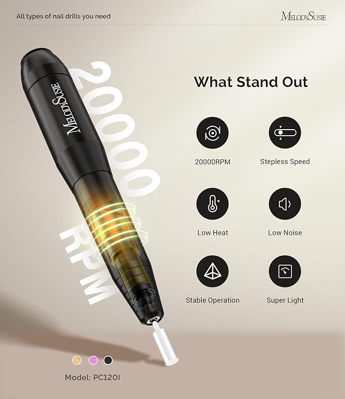 - PC120I Multifunctional Nail Drill Kit: Comes with 20,000RPM powerful rotary motor and 3/32” mental nail drill bits, this electric nail file can be used for all-around shaping, buffing, grinding, polishing, removing for acrylic nails, poly gel nails, artificial extension nails, thick nails, builder gel, dip powder, fake nails, natural nails, and cuticle dead skin.