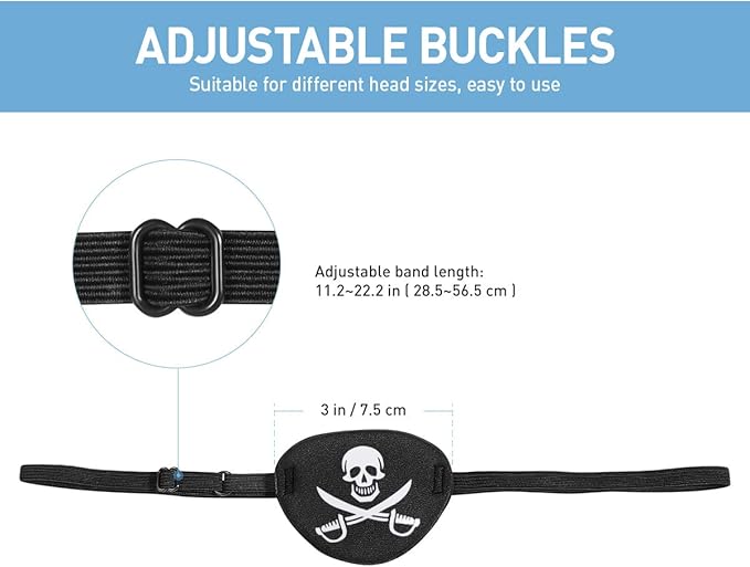 - Adjustable Fit for All Ages - With adaptability at its core, our pirate eyepatch adult come with an ingeniously designed adjustable strap system, the kids pirate eye patch making it universally fitting. Whether it's a toddler setting sail or an adult immersing themselves, this eye patch medical ensures a perfect fit, the black eyepatch molding seamlessly to faces of all shapes and sizes, thereby the eyepatch pirate eliminating any concerns of it being too tight or too loose.