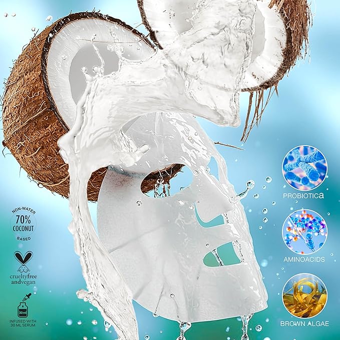 - DEEP HYDRATION & NOURISHMENT: Powered by Coconut Fruit Extract, Probiotics and Brown Algae, this hydrating sheet mask locks in moisture, restoring skin elasticity and suppleness for a plump and dewy complexion, giving a glass skin effect.