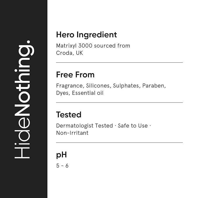 - [ CLEAN & TRANSPARENT BEAUTY ]: This serum is (i) Fragrance-free (ii) Silicones-free (iii) Sulfates-free (iv) Parabens-free (v) Essential Oils-free and (vi) Dyes-free. Also, it is non-comedogenic and hypoallergenic. Formulated at pH 5.0 - 6.0 formulated with premium quality of Matrixyl 3000 by Croda, UK and Bio-placenta by Labio, Korea, leading global suppliers of skincare ingredients.