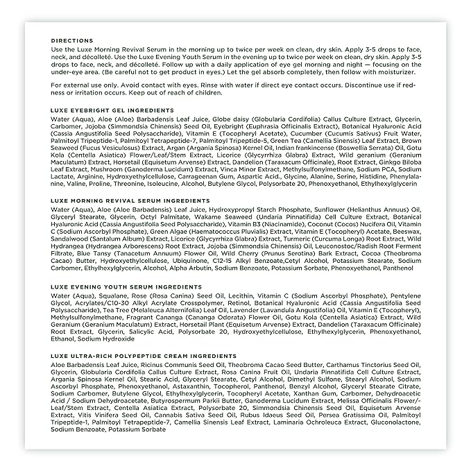 - Your total skin transformation awaits. The Luxe Eyebright Gel targets dark circles, puffiness, and crow’s feet. Luxe Morning Revival Serum awakens skin with brightening and smoothing properties. Luxe Evening Youth Serum helps combat fine lines and deeply hydrate the skin. Luxe Ultra-Rich Polypeptide Cream penetrates deep to plump and nourish.