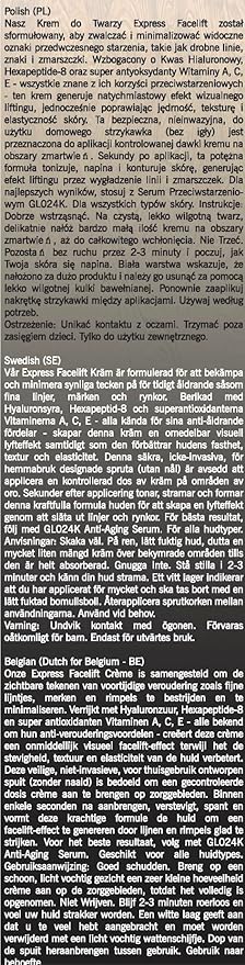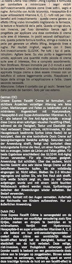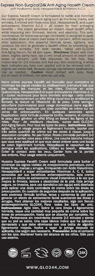 - ⚡️ EASY TO APPLY - SPA FACELIFT RESULTS AT HOME: GLO24K non-invasive Express Facelift Cream, in an exclusive no-needle syringe for an accurate application over areas of concern, injects powerful anti-aging ingredients onto the skin for instant facelift & wrinkle filling effects. It also reduces under-eye puffiness. Simply apply a very small amount over areas of concern (avoid contact with eyes), stay still and see how fine-lines & wrinkles diminish or disappear within minutes. Use as needed.