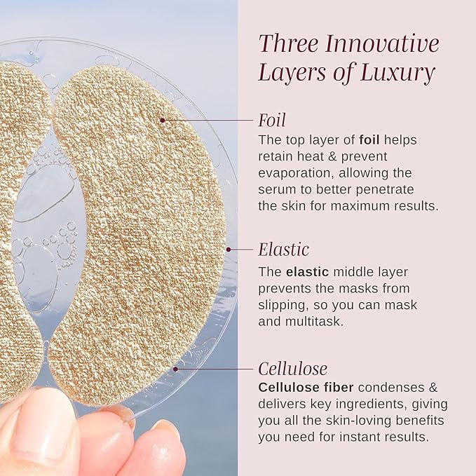 - Multi-Layer Absorption Technology - The top layer of foil helps prevent evaporation, allowing the serum to deeply penetrate the skin. Its elastic middle layer prevents the eye mask patches from slipping, while the bottom layer of cellulose fiber delivers key ingredients to the delicate under eye area to deliver maximum skin-loving benefits and a smooth skin texture.