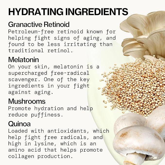 - HYDRATING OVERNIGHT MASK-IN-A-CREAM – Wake Up Beautiful doubles as a deeply hydrating sleep mask. Infused with hyaluronic acid and vegan squalane, it drenches your skin in moisture to prevent the dryness often associated with retinol. Nourishing botanicals like quinoa and mushroom extracts support skin’s barrier and calm irritation, so you wake up with a soft, dewy complexion. No more flakiness – just fresh, hydrated skin by dawn.