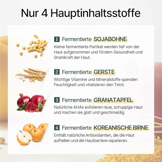 - [Key Ingredient] Enriched with fermented bean, barley, pomegranate, and Korean pear. It strengthens skin health, moisturizes & revitalizes skin tone, exfoliates & smooths skin texture, and provides natural antioxidants rich in vitamin C&E.