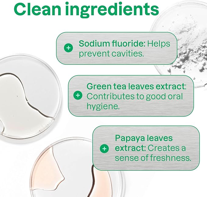 - TOOTHPASTE MADE FROM THOUGHTFUL INGREDIENTS: Made from plant and mineral-based ingredients like green tea leaves, which have antioxidant properties and help maintain good oral and dental health and papaya leaves, which contain papain, and combined with brushing, this toothpaste contributes to reducing plaque