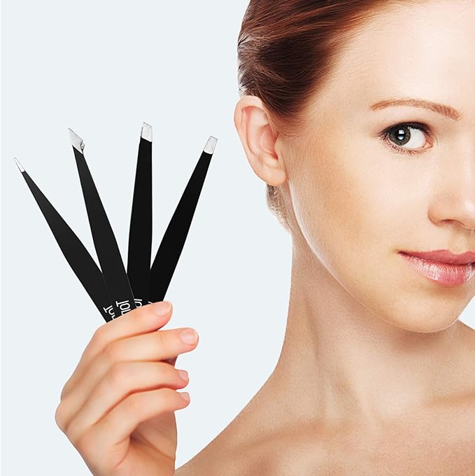 Tweezers for Eyebrows, 4-piece Slant Tip and Pointed Eyebrow Tweezer Set Great Precision for Eyebrows Facial Hair, Ingrown Hair, Splinter, Blackhead and Tick Remover (Black)