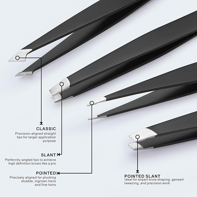 - This set contains classic, slant, pointed, pointed and slant tweezers to meet different needs. Each tweezer tip is hand-filed, sharpened, assembled and adjusted for accuracy, strength, and durability.