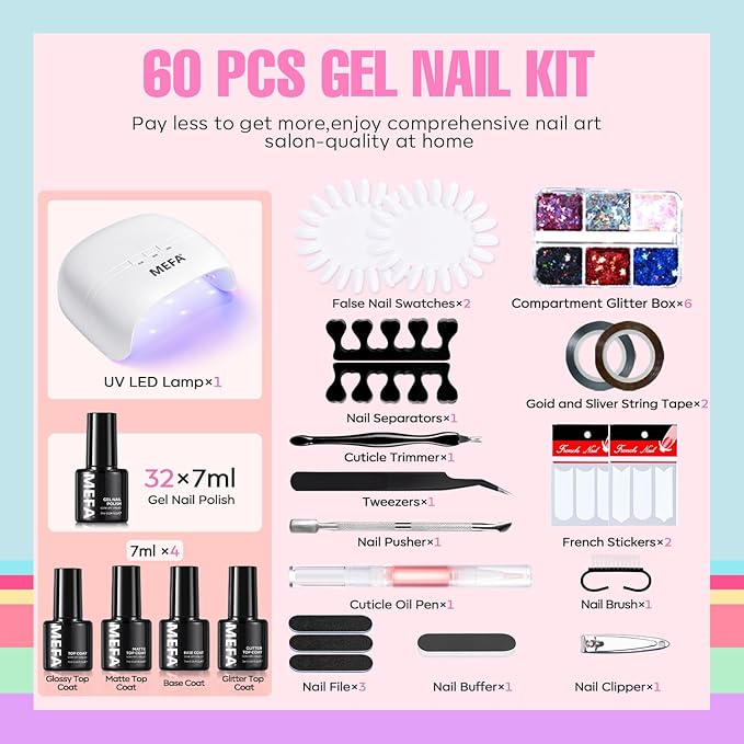 MEFA 60 Pcs Gel Nail Polish Kit with U V Light, 32 Colors Classic Popular Nail Kit Soak Off Nail Polish Gel Set with Matte/Glossy Base Top Coat Easter Decorations Manicure Tools Gifts for Women