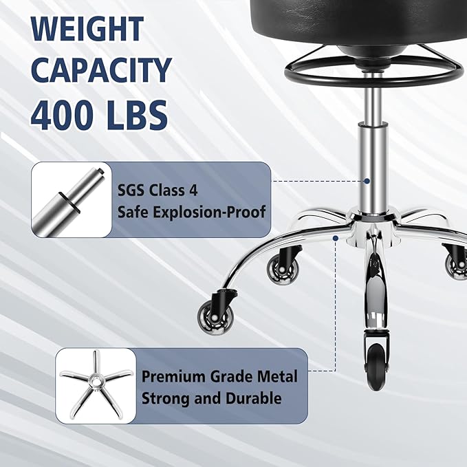 - 【400LBS WEIGHT CAPACITY】 This rolling stool with wheels is constructed of strong chrome finish base and heavy duty casters,massage stools,stool chair can hold up to 400lb, ideal solution for salon, studio, tatoo,message,medical professionals as well as at-home daily use.