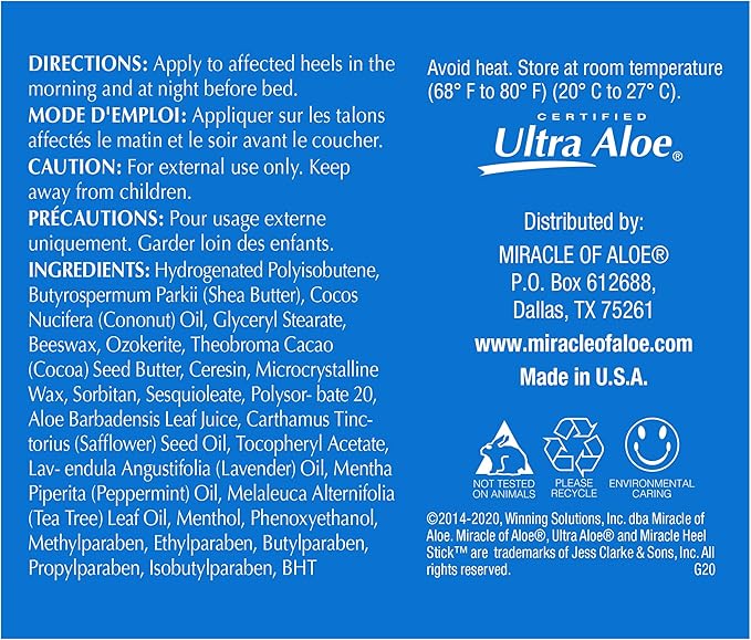 - Miracle Heel Stick is blended with Shea and Cocoa butters and Aloe to penetrate, moisturize and soften stressed dry hard heels; helps end painful cracks and fissures; contains healing Tea Tree Oil; light peppermint scent