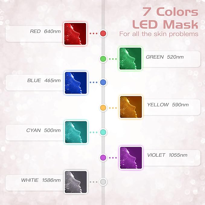 - 7 Color LED FACIAL LIGHT THERAPY MASK: We have 7 colors to choose from to meet the diverse needs of skin.