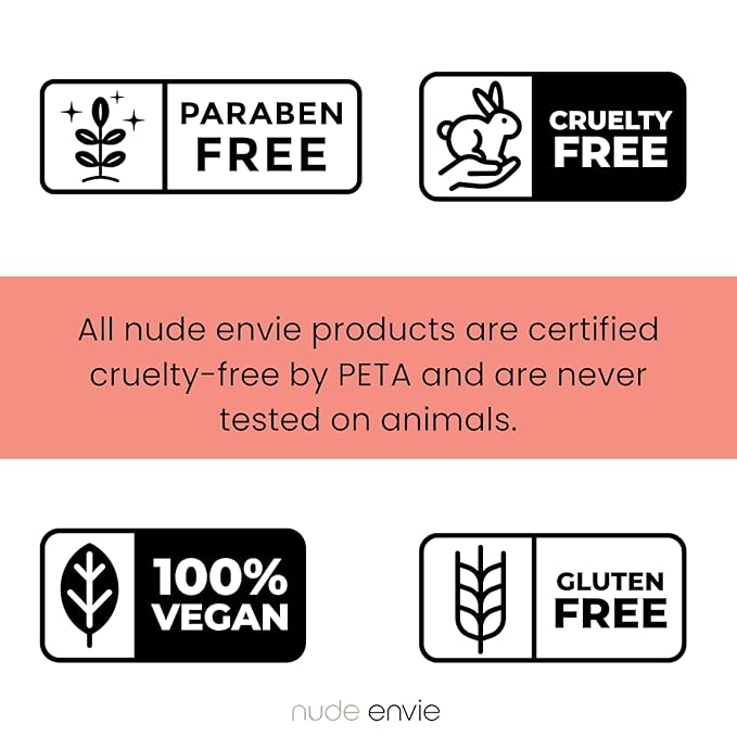 - Certified Vegan, Cruelty-Free, and Paraben Free- Nude Envie is carefully crafted using the finest ingredients. All products are certified vegan, cruelty-free, paraben-free, and gluten-free.