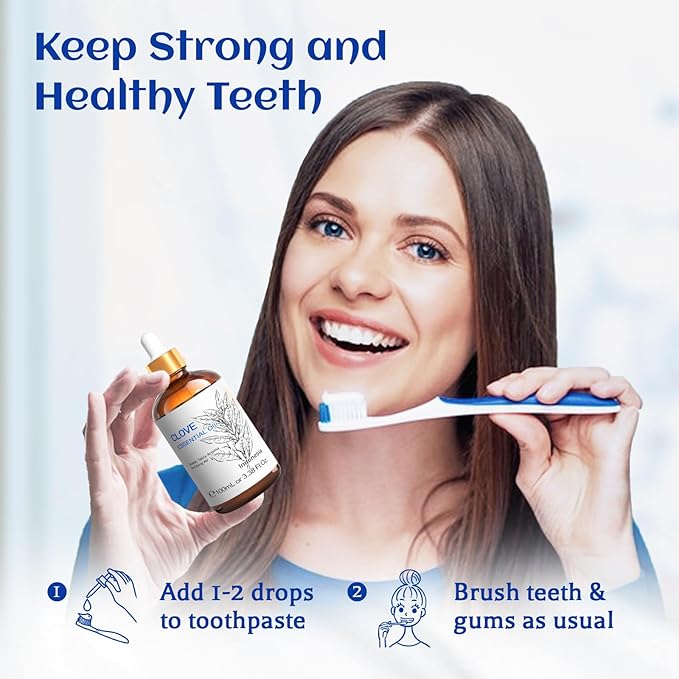 - Oral Care: Clove essential oil is a multi-purpose natural healing oil that can not only relieve gums pain, soothe toothache, but also refresh breath, improve oral hygiene, and keep strong and healthy teeth, find relief for sensitive gums