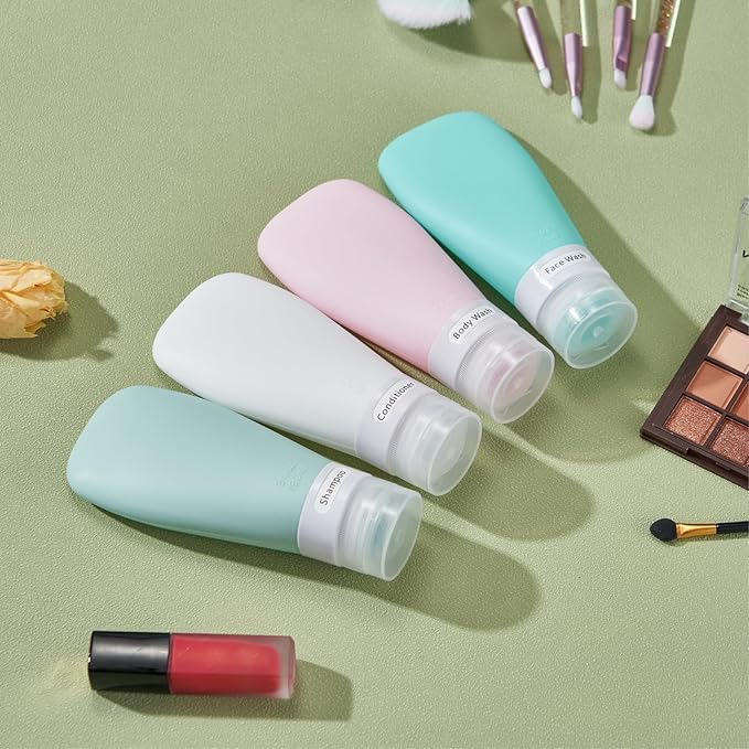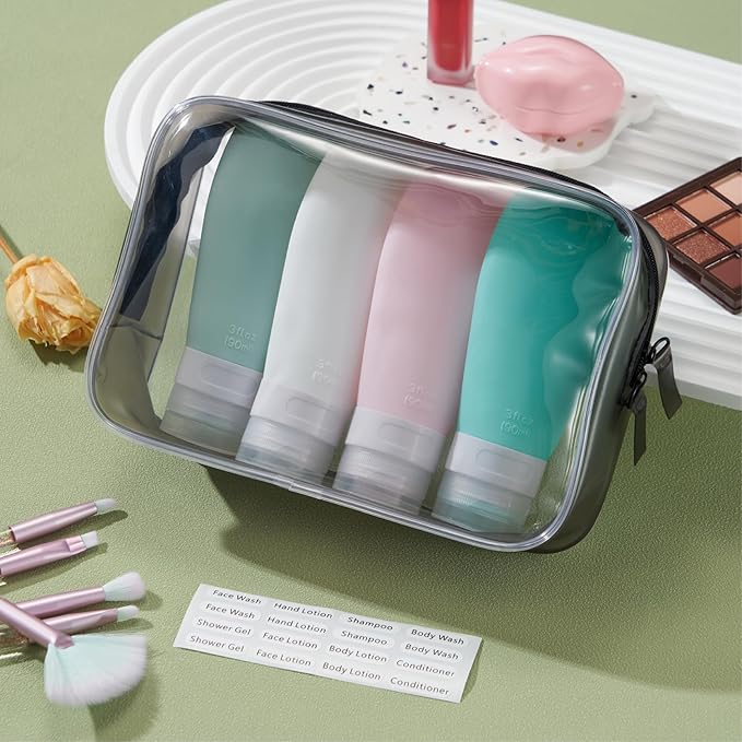 • TSA Carry on Approved: 4 pack 3 ounce silicone travel bottles, perfect for shampoo, conditioner, body wash, lotion, hand sanitizer, shower gel. Packed with a high quality zippered clear toiletry bag, saving space, easy to carry with for travels or gym workout.