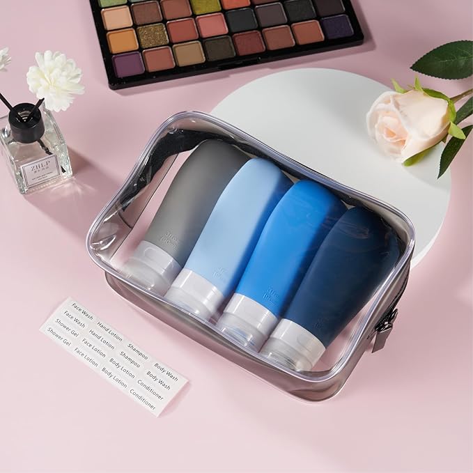 • TSA Carry on Approved: 4 pack 3 ounce silicone travel bottles, perfect for shampoo, conditioner, body wash, lotion, hand sanitizer, shower gel. Packed with a high quality zippered clear toiletry bag, saving space, easy to carry with for travels or gym workout.