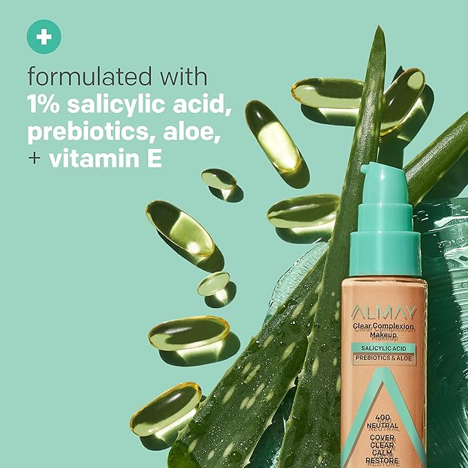 Almay Clear Complexion Acne Foundation Makeup with Salicylic Acid - Lightweight, Medium Coverage, Hypoallergenic, Fragrance-Free, for Sensitive Skin, 600 Sun Beige, 1 fl oz.