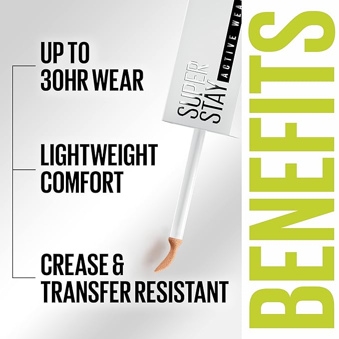 - Maybelline's Super Stay Active Wear Concealer delivers up to 30-hour wear and full coverage; This long lasting concealer wipes out dark circles and imperfections, giving you a comfortable, natural look
